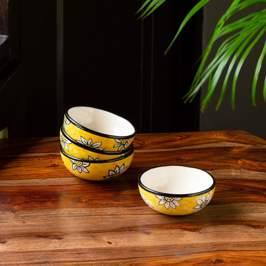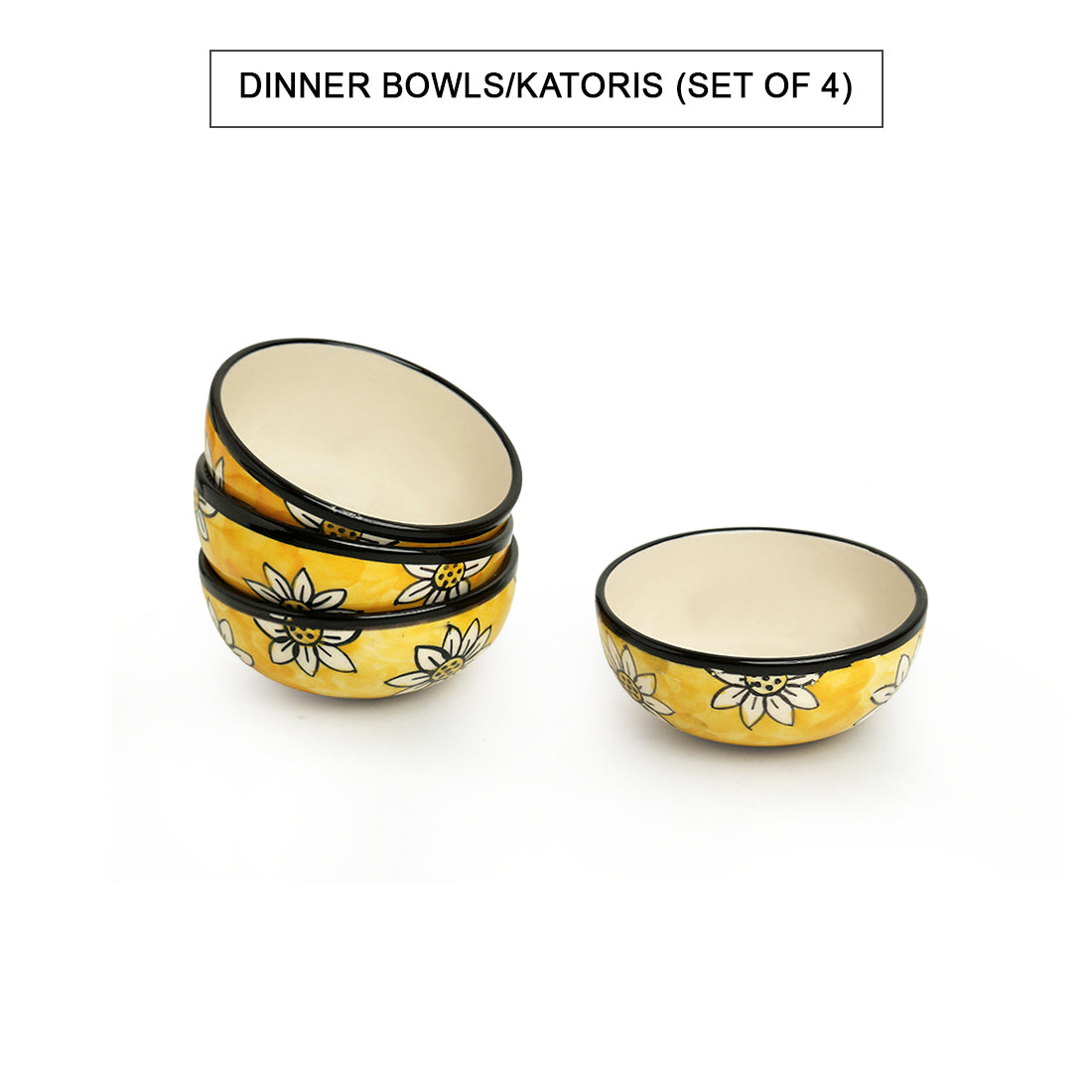 Californian Sunflowers – Hand-Painted Ceramic Dinner Bowls (Katoris) (Set of 4 | 180 ml Each | Microwave Safe)