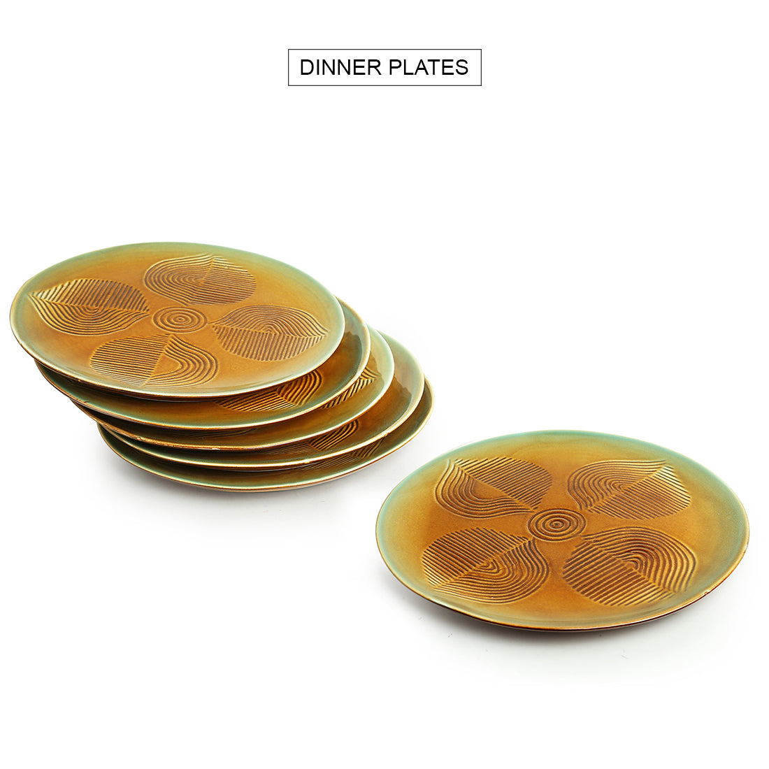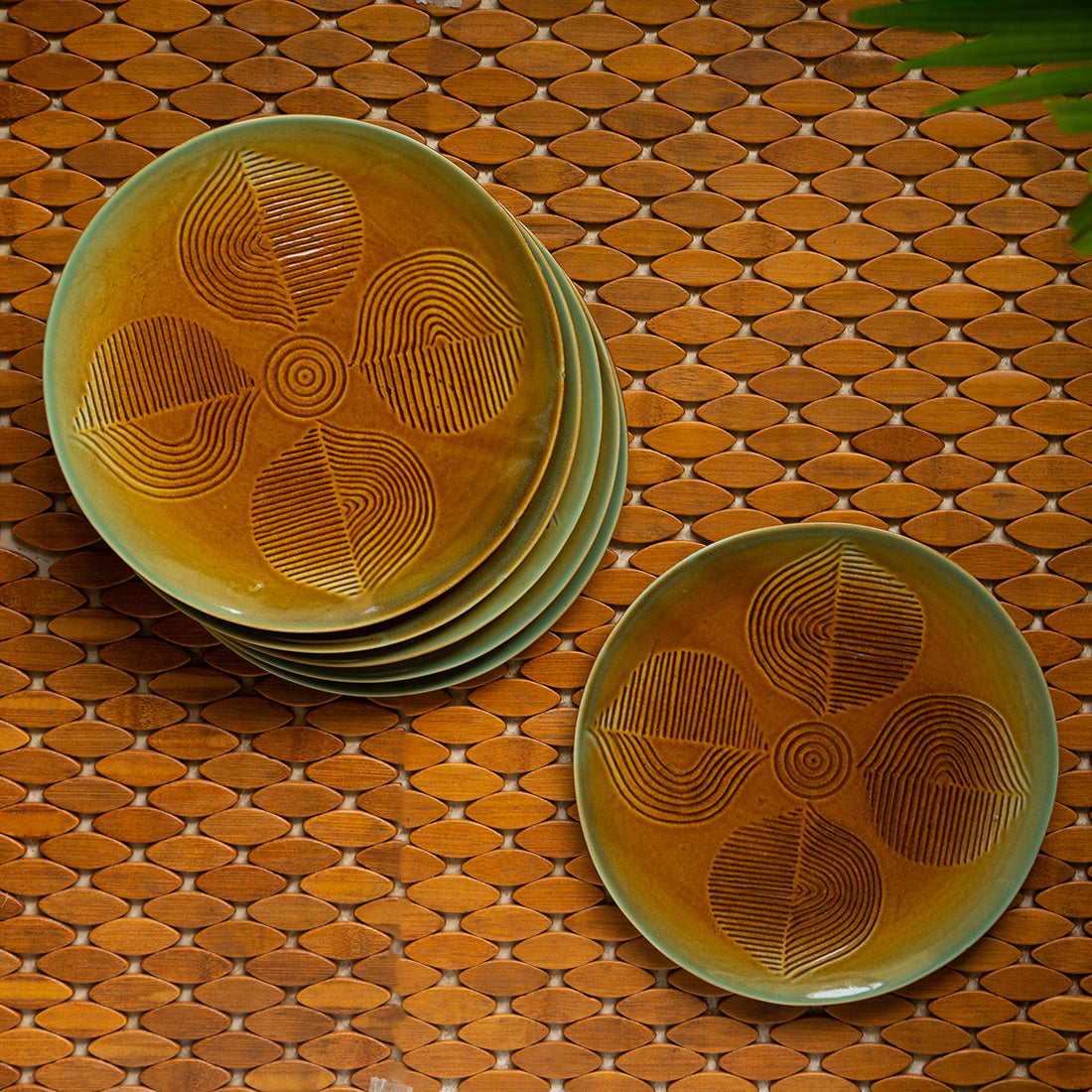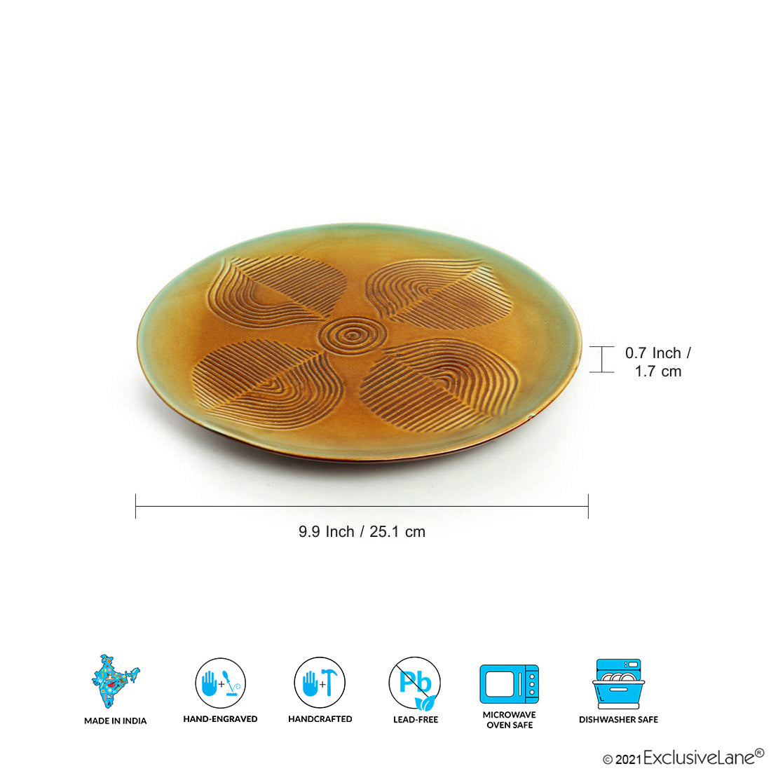 Let every meal feel like a forest walk kissed by rain—serene, earthy, and alive with wonder. ‘Feathers of Grace’ dinner plates carry the legacy of the wild through abstract peacock feathers hand-engraved onto warm ceramic clay, kissed with sea green edges. Fired at 1280°C, these plates aren't just stunning—they're strong, safe, and built to endure your daily feasts with poise.