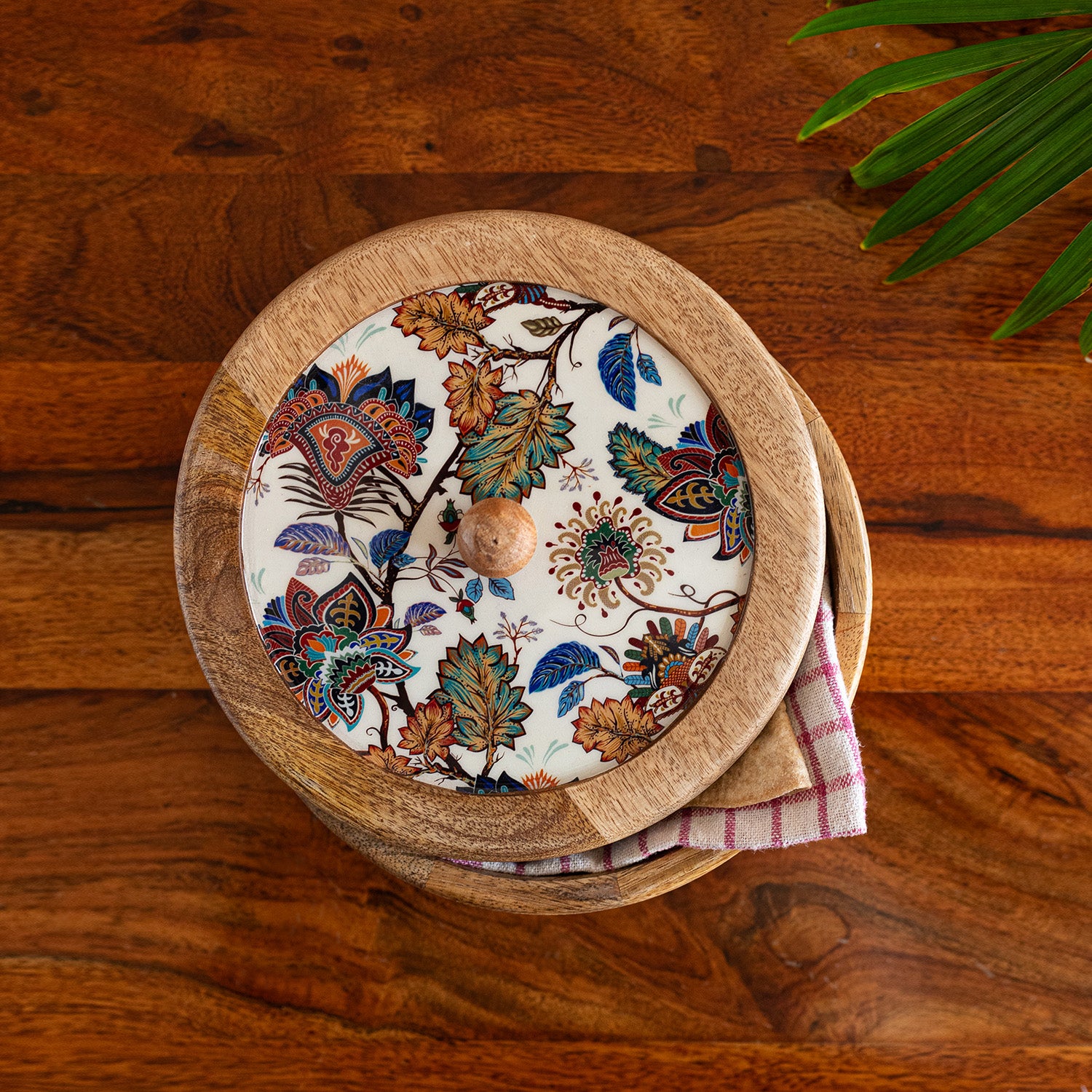Handcrafted from mango wood and finished with clear enamel and floral printed decals, this rounded box with a sphere-handle lid is both decorative and practical. Perfect for storing and serving chapatis, bread, wraps, tortillas or even small knick-knacks, medicines, and more.