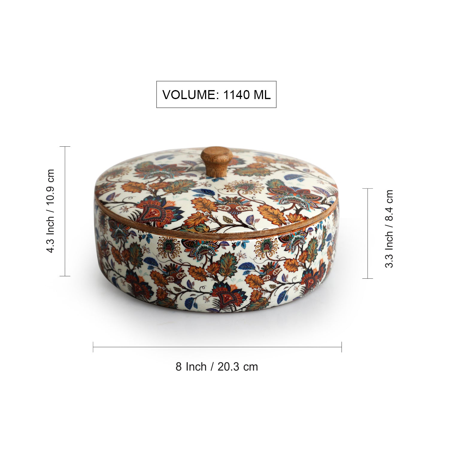 Designed for everyday grace and occasional grandeur, the box features a snug-fitting wooden lid to keep chapatis or papads fresh and warm. Its laminated enamel finish adds durability while making it a beautiful centrepiece for your dining table or kitchen shelf. More than just a chapati box, it's a versatile keeper of snacks, medicines, or everyday knick-knacks.