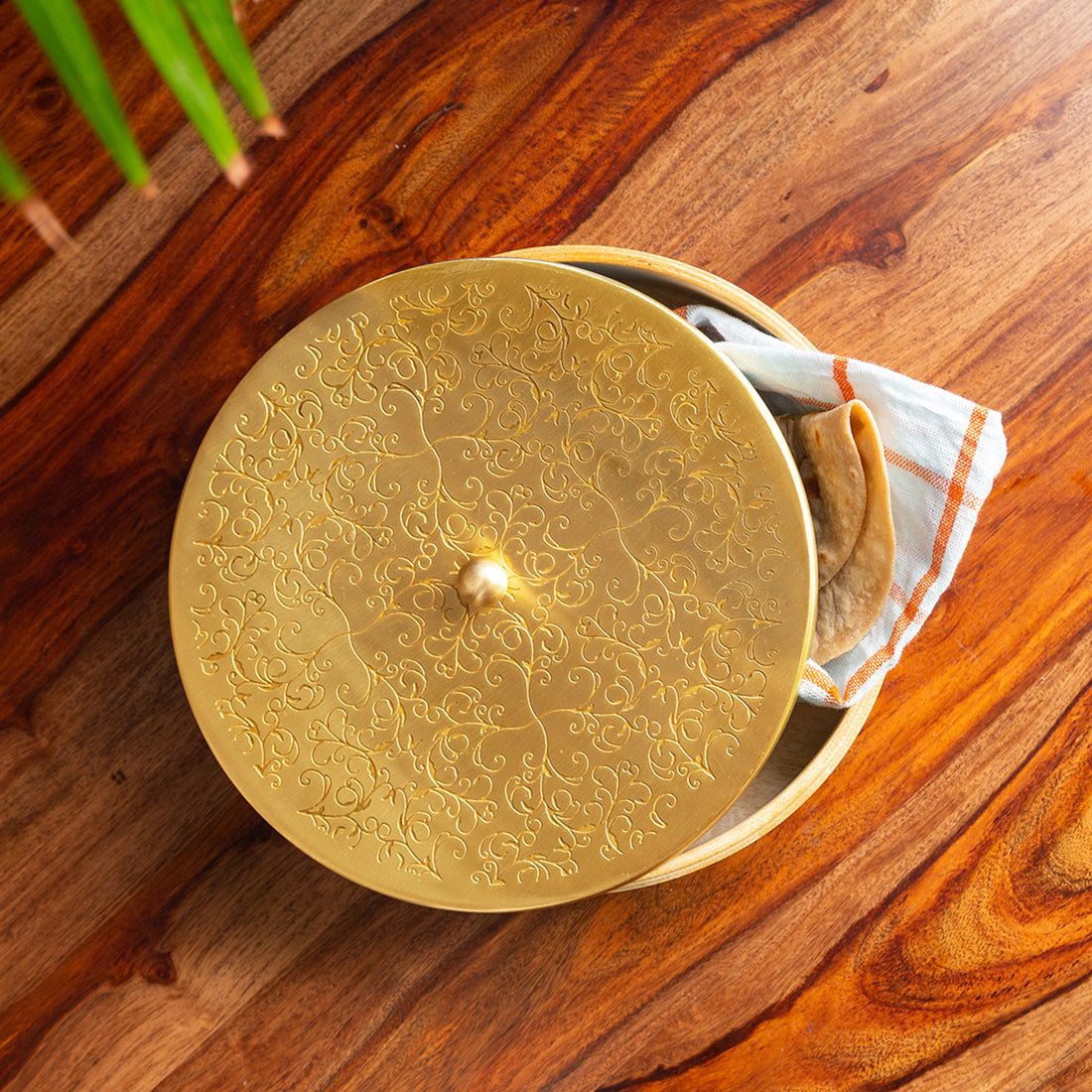 Gleaming with soft golden tones and finished in a matte polish, the lid radiates timeless charm, while the light brown wooden base grounds the piece with earthy warmth. More than just a chapati box, it's a versatile container — perfect for storing khakhras, papads, jewellery, or daily essentials.