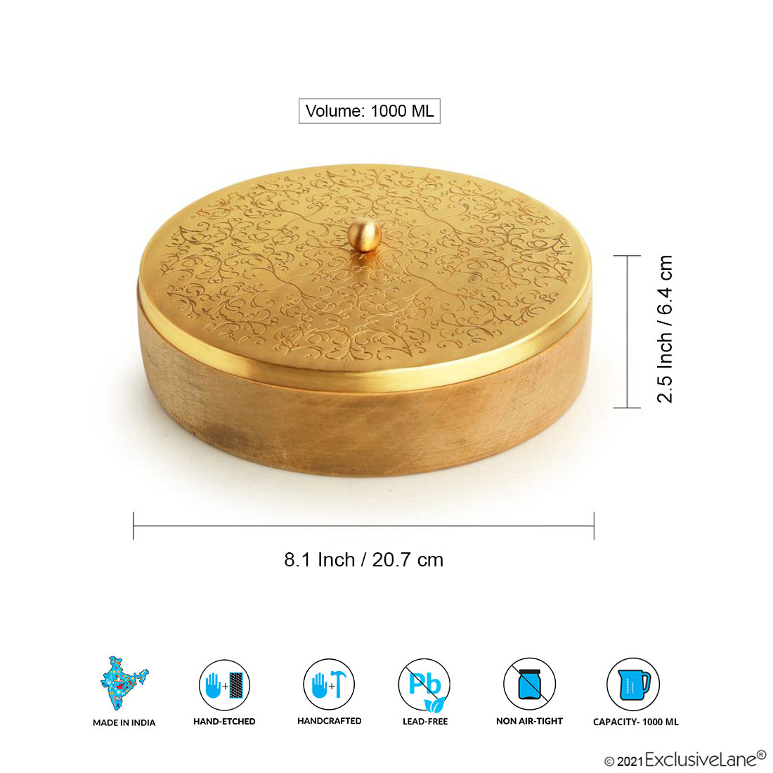 Floral-Etched – Handcrafted Chapati Box in Brass & Mango Wood (1000 ml | Brass Lid with Hand-Etched Floral Motif | Artisan-Made)