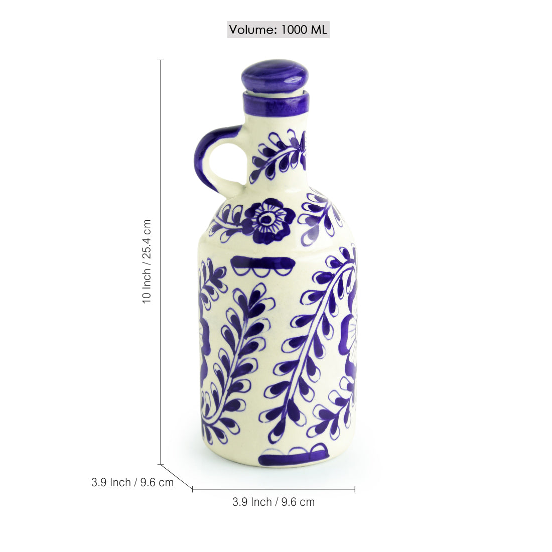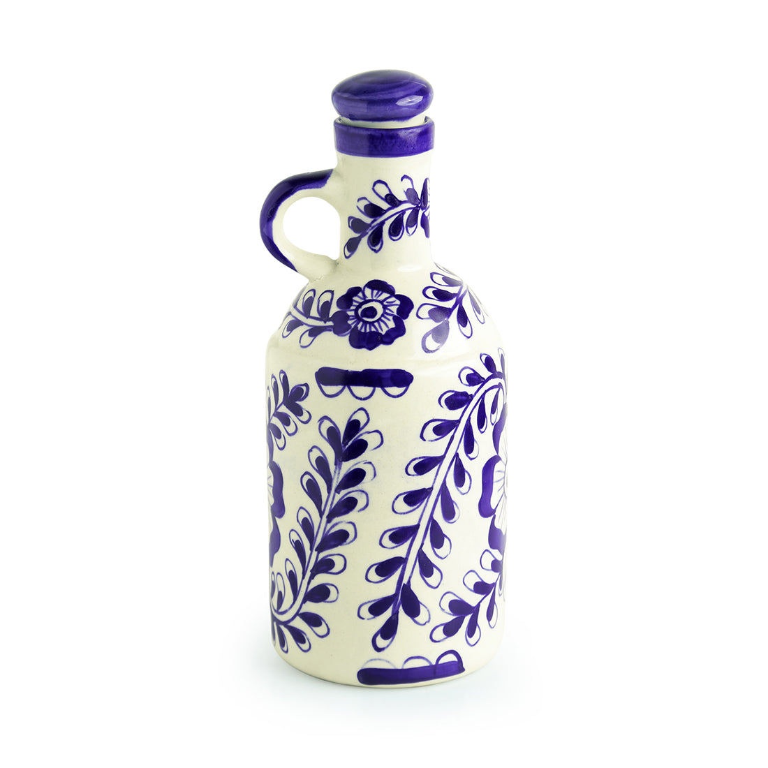 “Flowy Flora” Hand-Painted Mughal Ceramic Oil Bottle (1000 ml) – Ink Blue & White Elegance