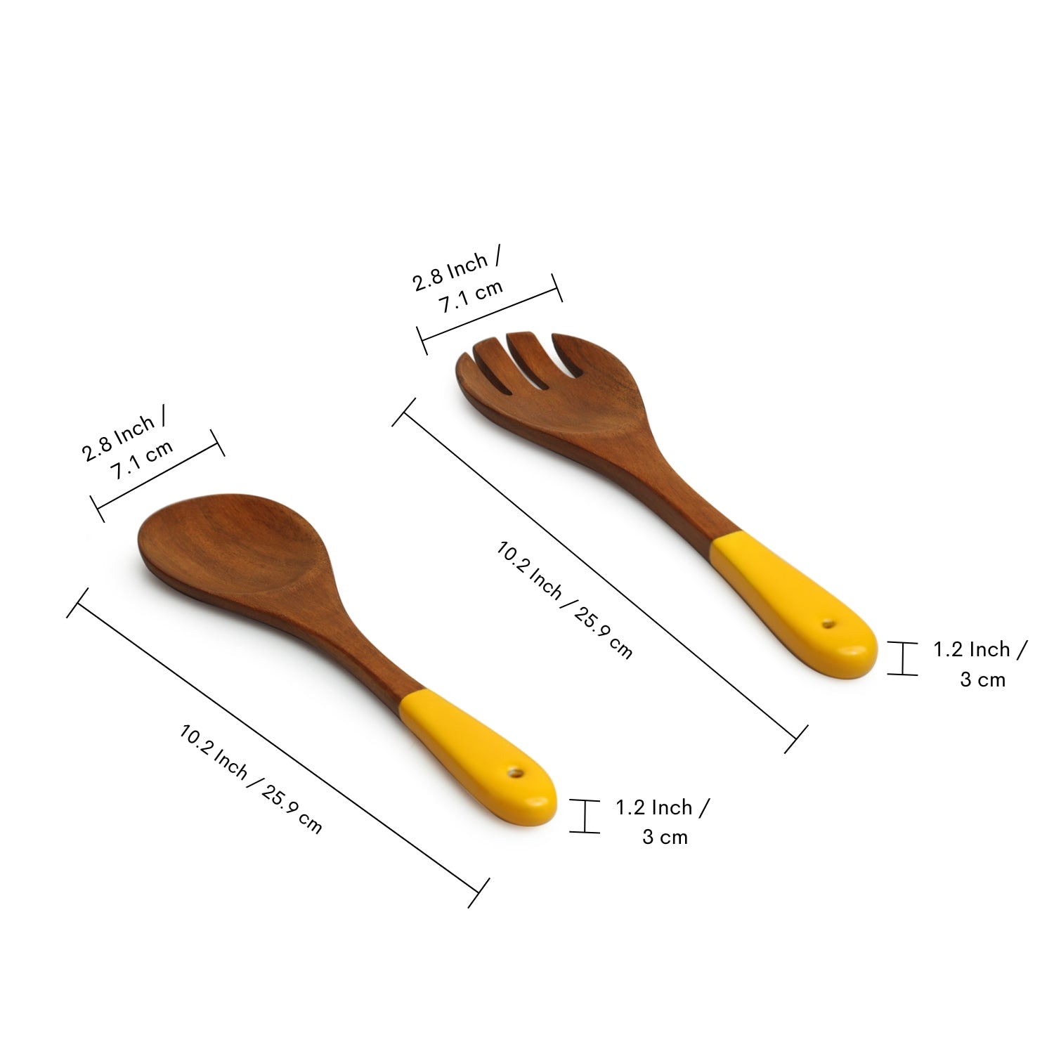 The bowl is paired with a matching set of serving spoon and fork, designed with partially enamelled handles to echo the bowl’s signature hue. Whether you're tossing fresh greens or serving warm curries and dals, this set merges rustic elegance with everyday functionality.