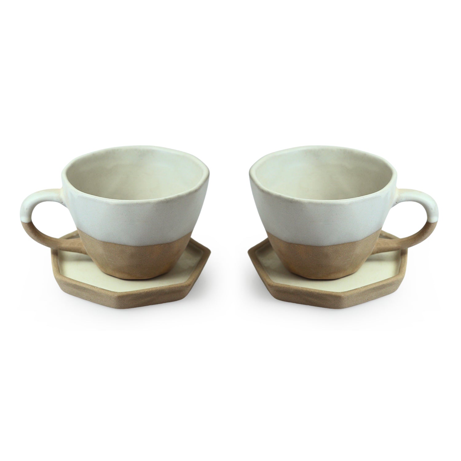 This handcrafted ceramic set of 2 cups and saucers blends elegance and utility: