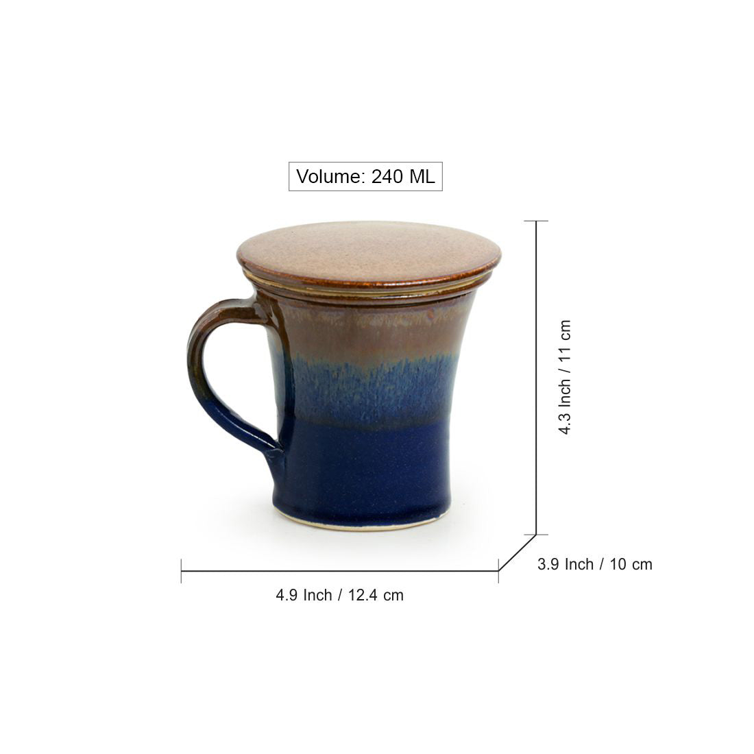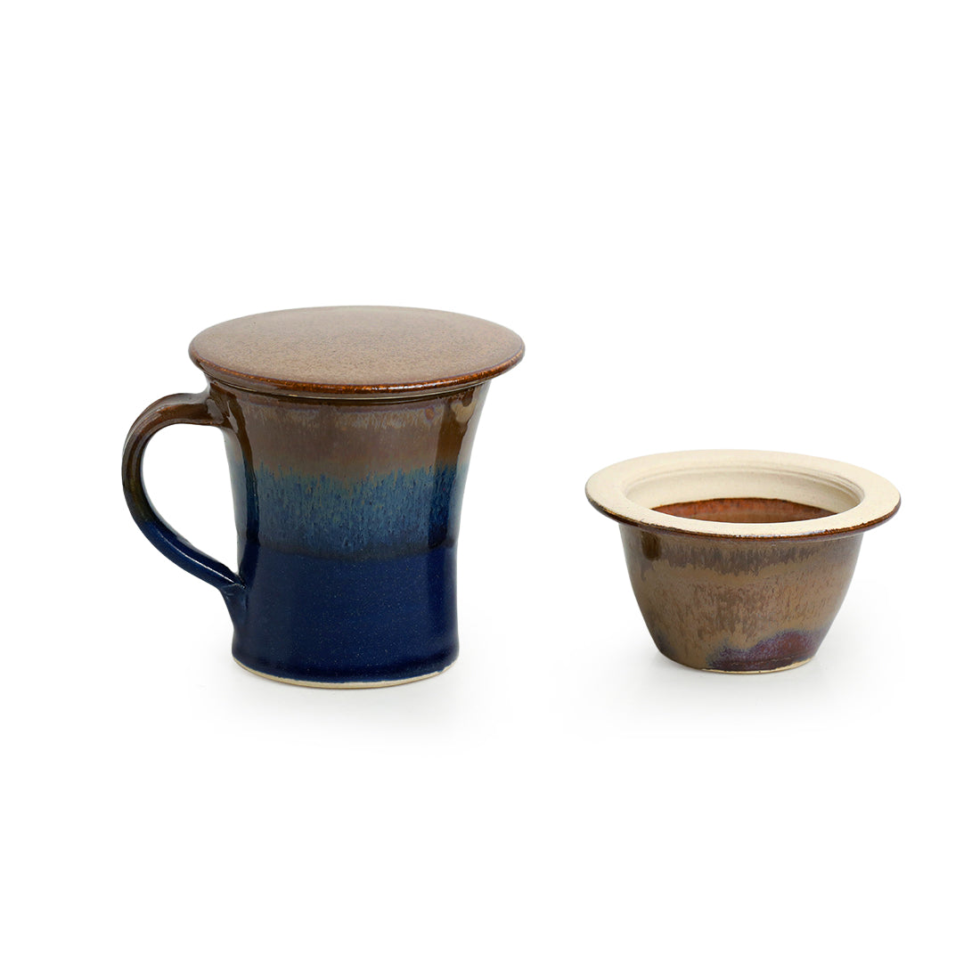 Begin your mornings with quiet elegance using this exclusive handcrafted studio pottery green tea filter mug from our 'Morning Musts' collection. Meticulously shaped and glazed by skilled artisans, each mug is a unique work of functional art, blending earthy light brown tones with sophisticated navy blue accents.