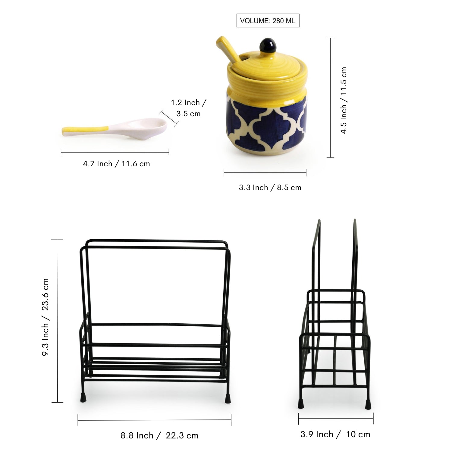 Moroccan Hand-Painted Ceramic Jam Jar Set With Spoons and Iron Caddy