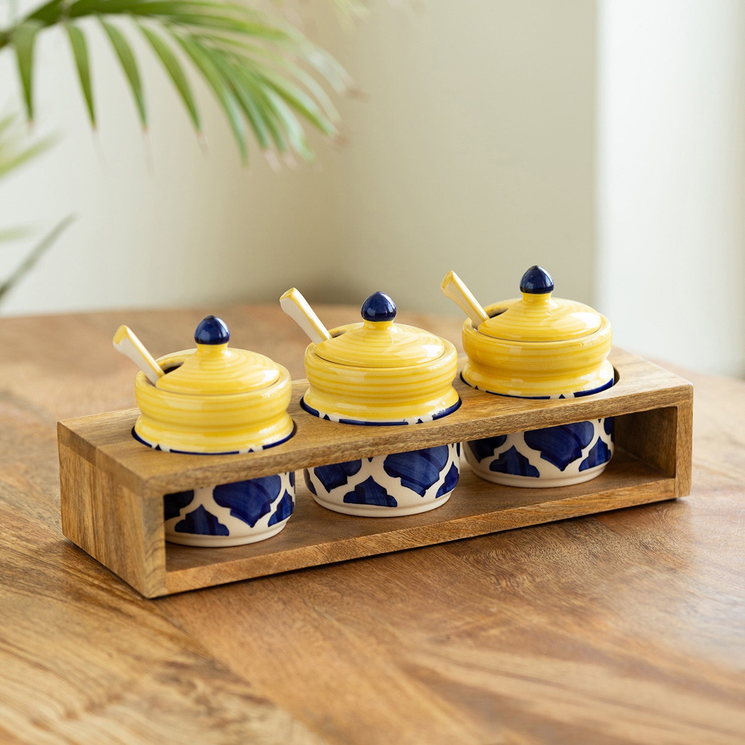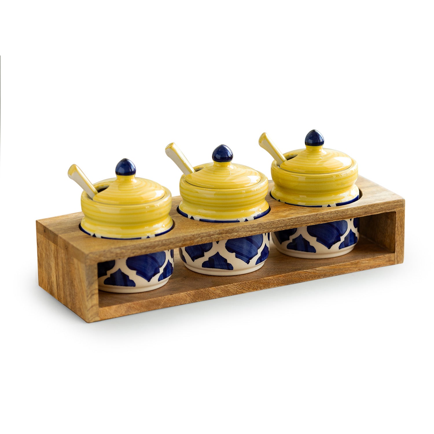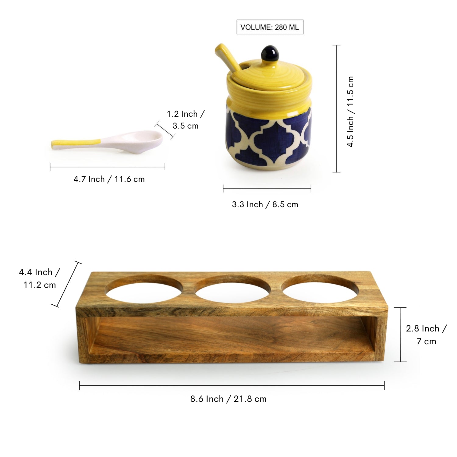 Moroccan Mosaics – Hand-Painted Ceramic Jar Trio with Spoons & Mango Wood Holder (280 ml x 3)