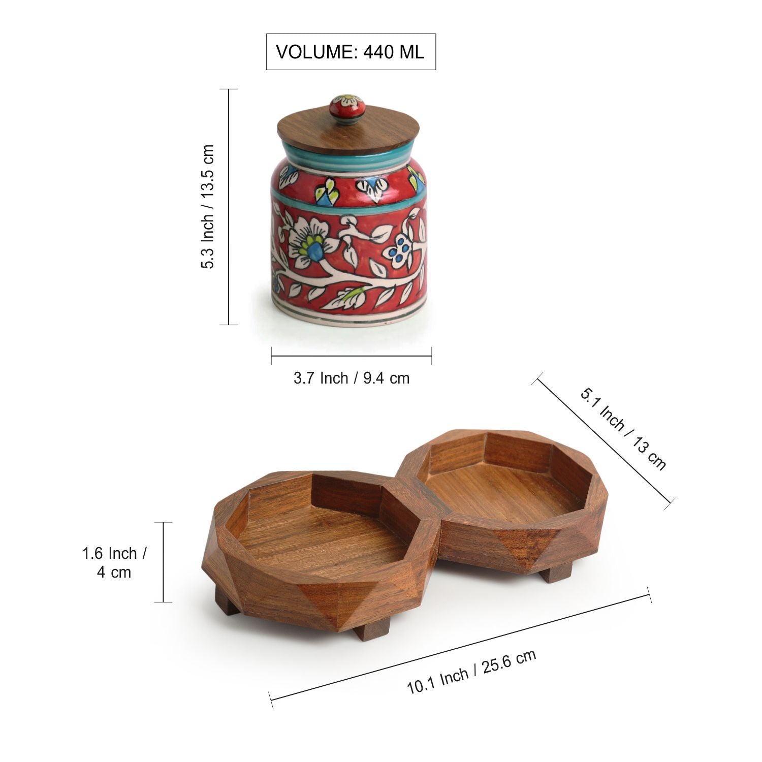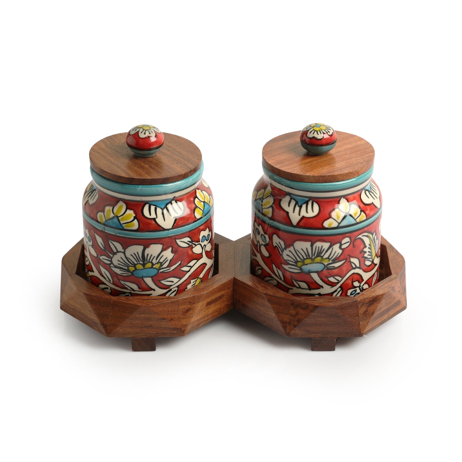 Mughal Elegance – Hand-Painted Ceramic Jar Set with Sheesham Tray (440 ml x 2)