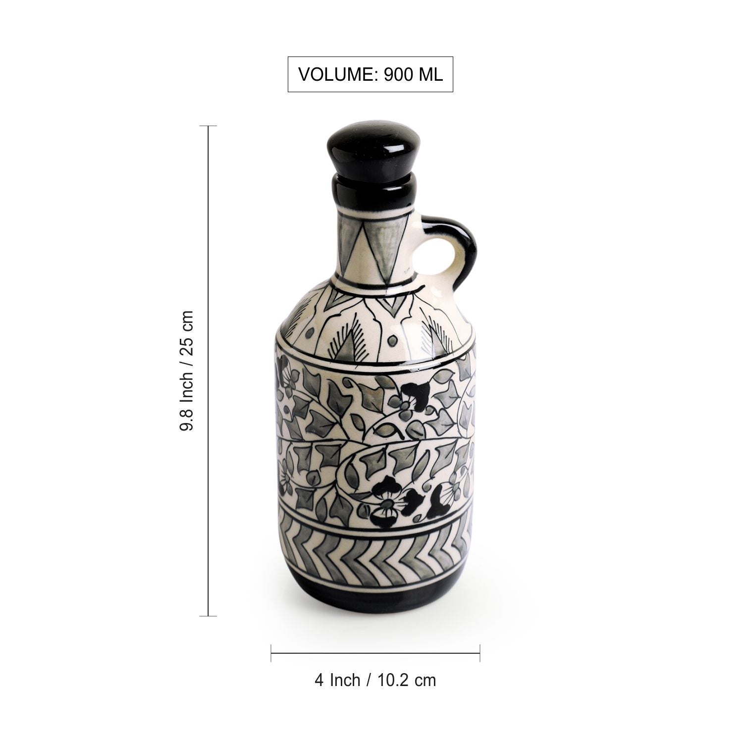“Mughal Floral – Monochrome Elegance” Hand-Painted Ceramic Oil Bottle (900 ml, White & Black)