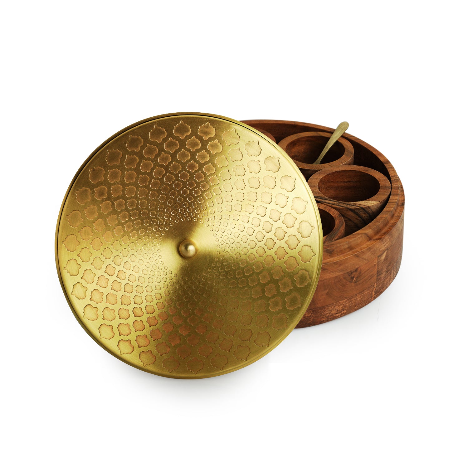 Handcrafted in rich Acacia wood, and topped with a hand-etched golden brass lid, it holds 7 removable containers (60 ml each) — perfect for your most cherished spices. Whether you're storing cumin, cardamom, or clove, this box transforms everyday ingredients into a celebration of art and aroma.