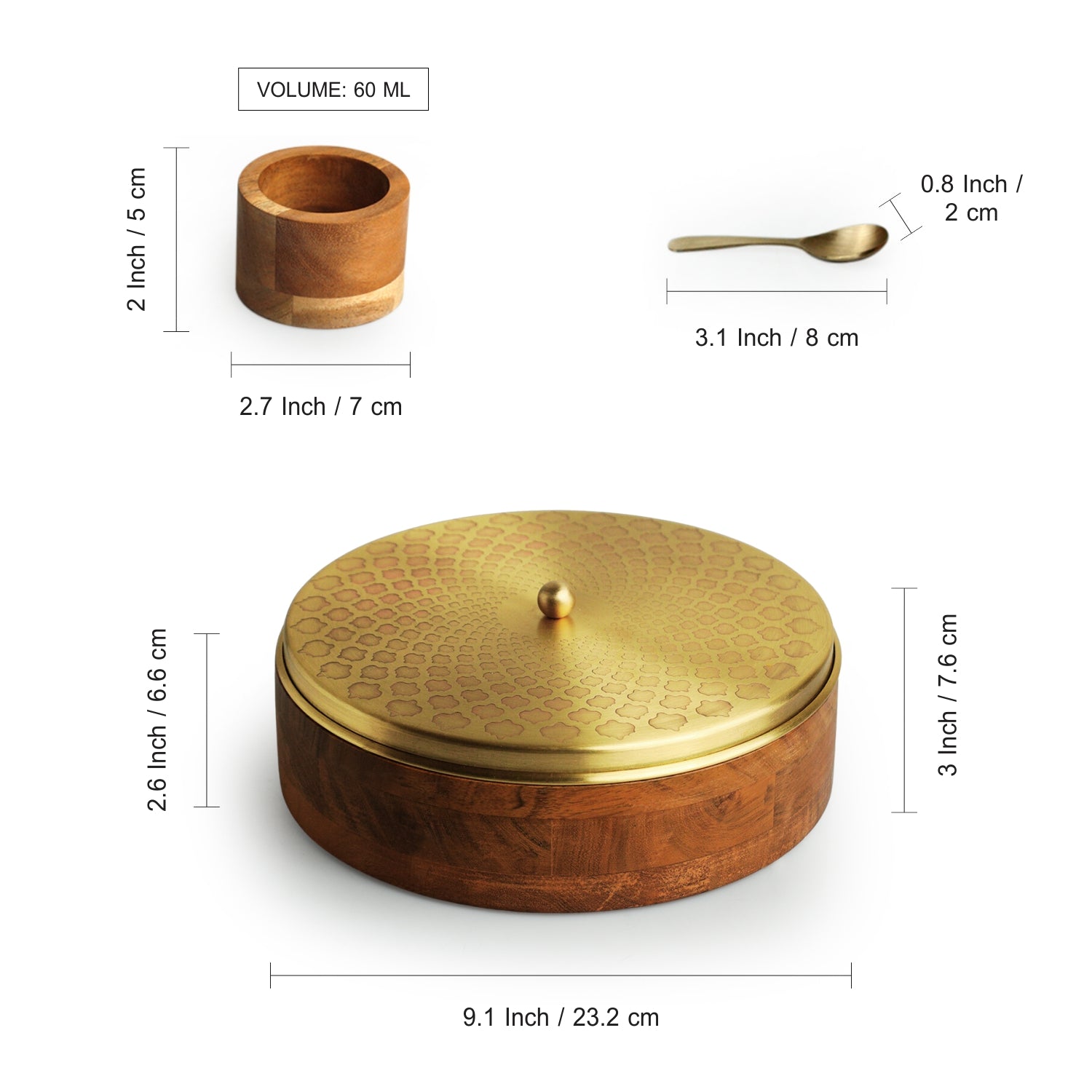 - Materials: Box & Containers – Acacia Wood, Lid & Spoon – Brass