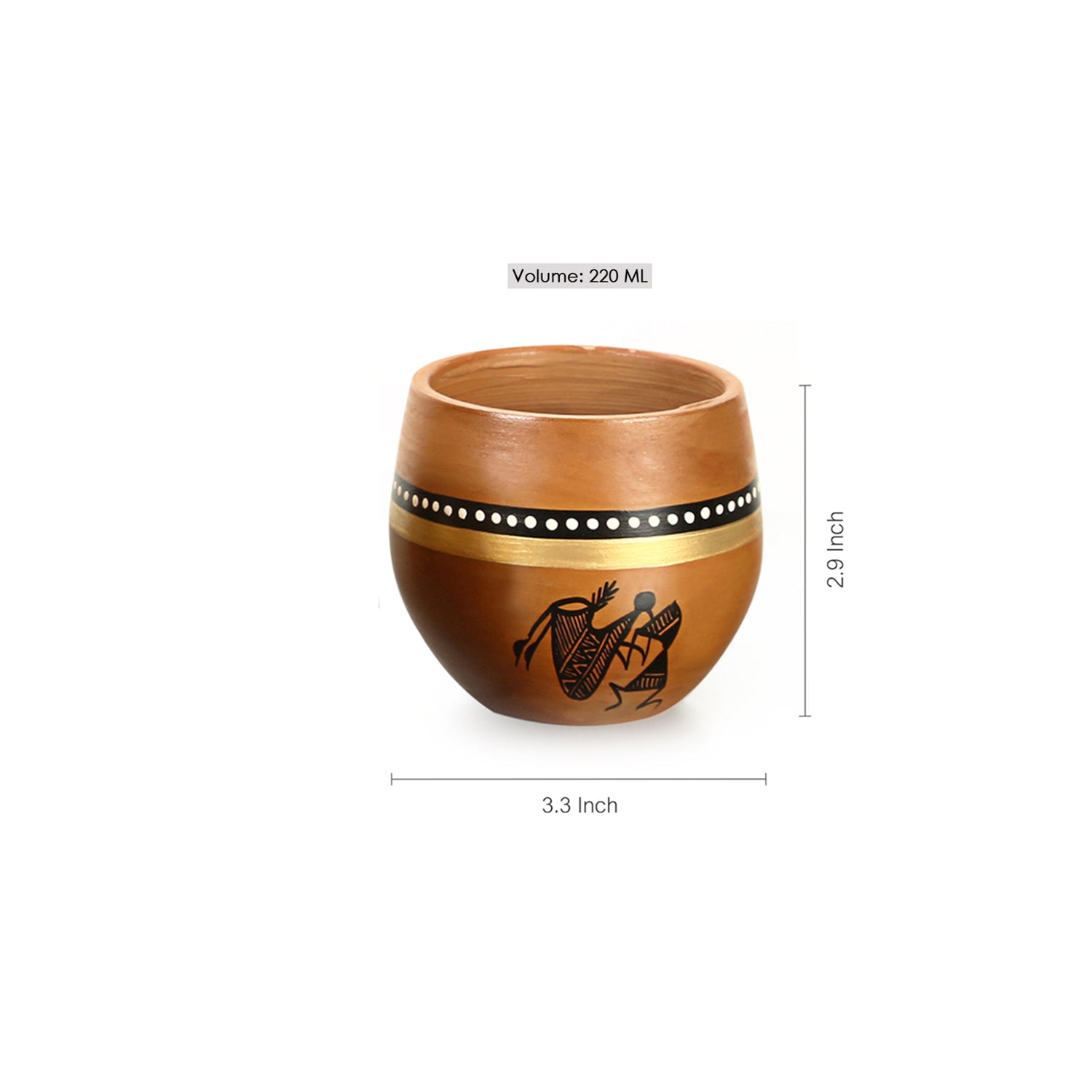 Celebrate India’s rustic heritage with this exquisite set of four handcrafted terracotta kulhads, adorned with intricate Warli tribal art. Each kulhad (220 ml capacity) is lovingly shaped from natural clay and hand-painted by artisans from rural India, bringing scenes of tribal life and festivity to your table. The earthy mud-brown hue and minimalist Warli motifs make these tumblers perfect for serving tea, coffee, or traditional beverages—infusing every sip with artistry and nostalgia.