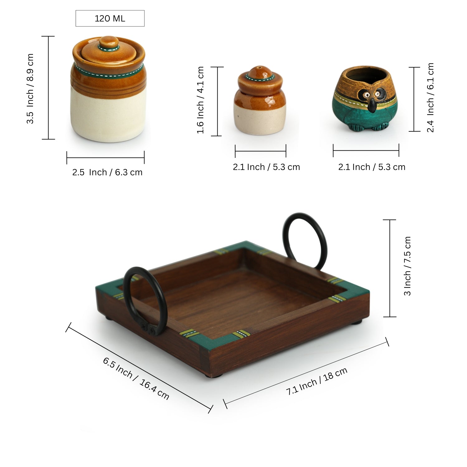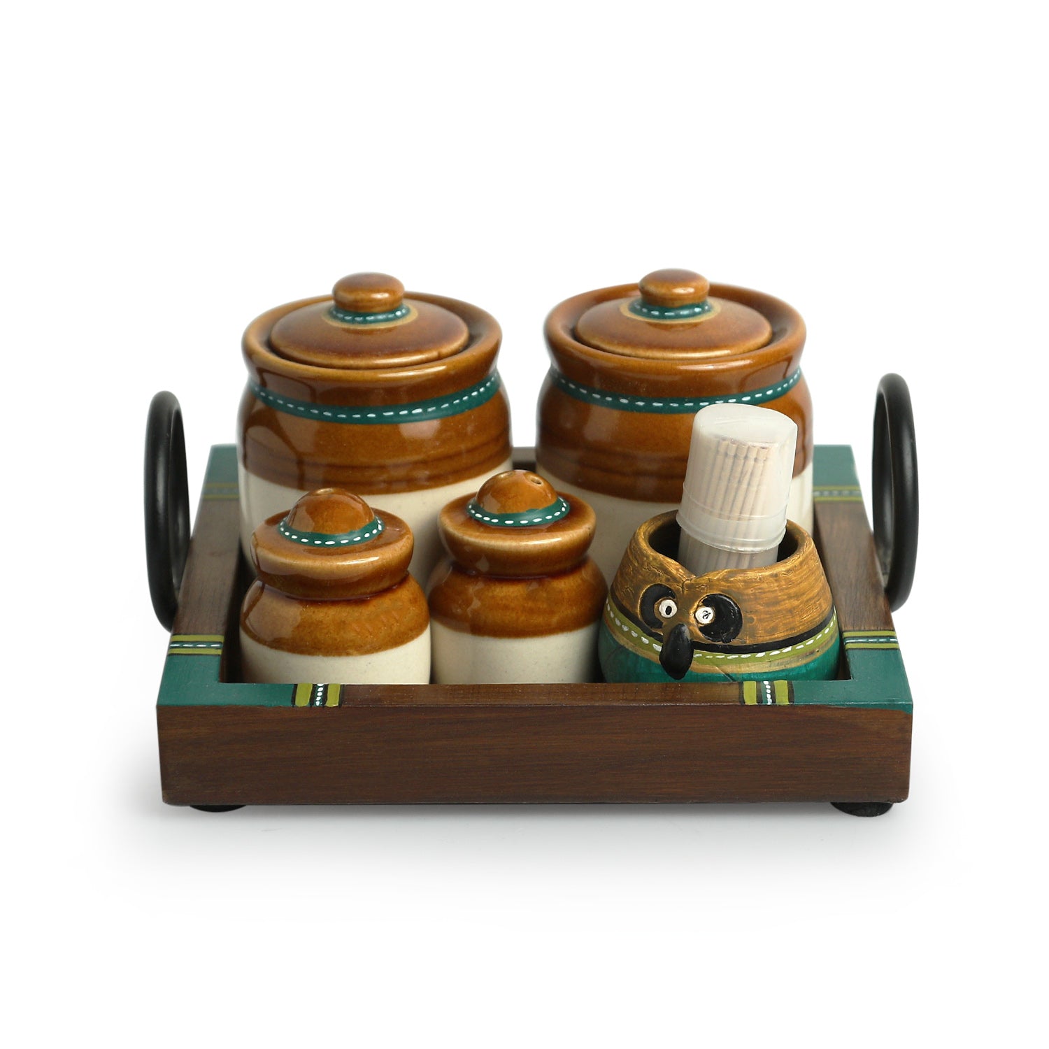 Material: TRAY: Mango Wood, JARS: Ceramic, SHAKERS: Ceramic, TOOTHPICK HOLDER: Terracotta