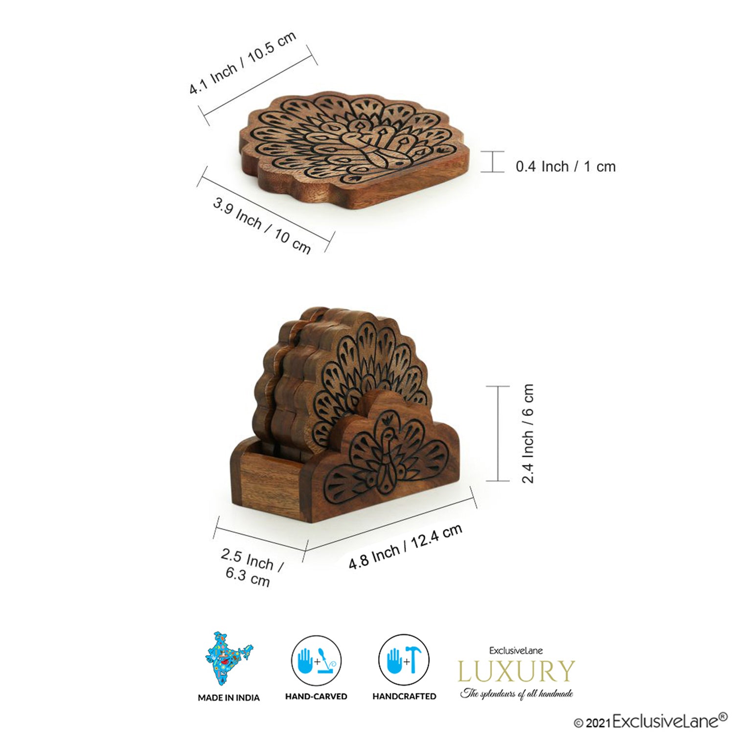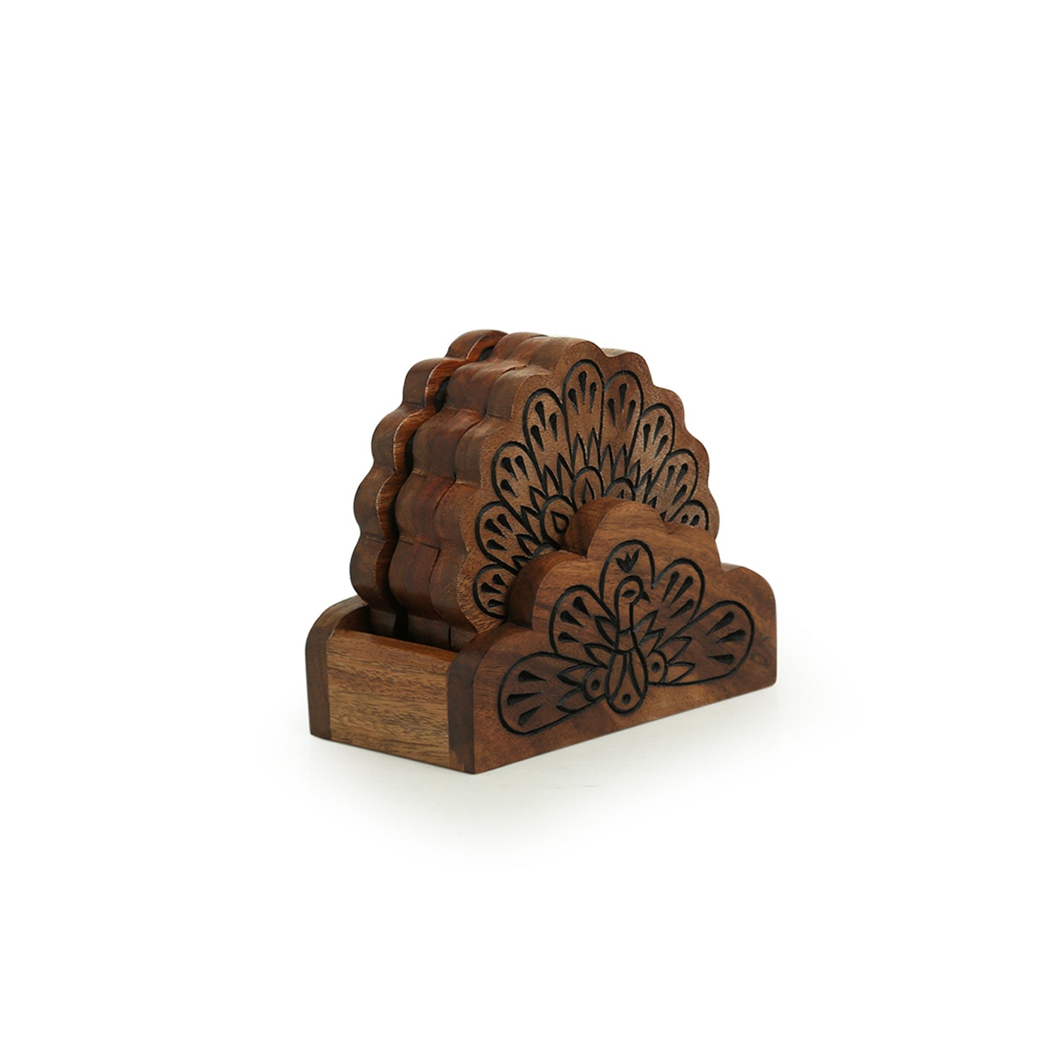 “Peacock Woods” Hand-Carved Coaster Set in Sheesham Wood (Set of 4 + Stand)