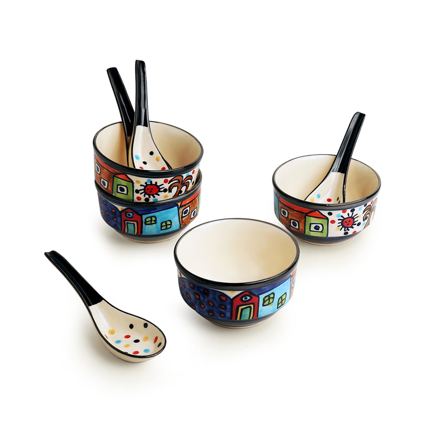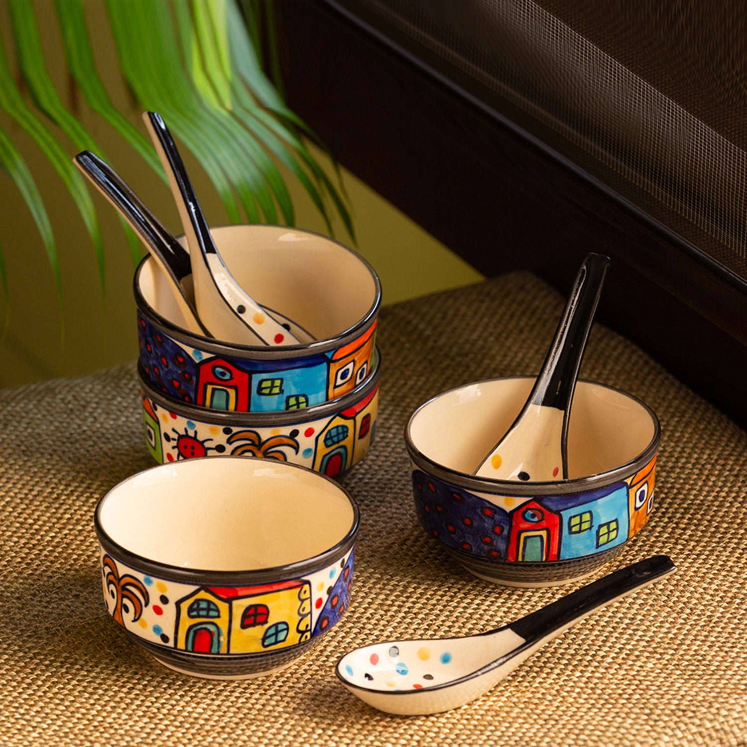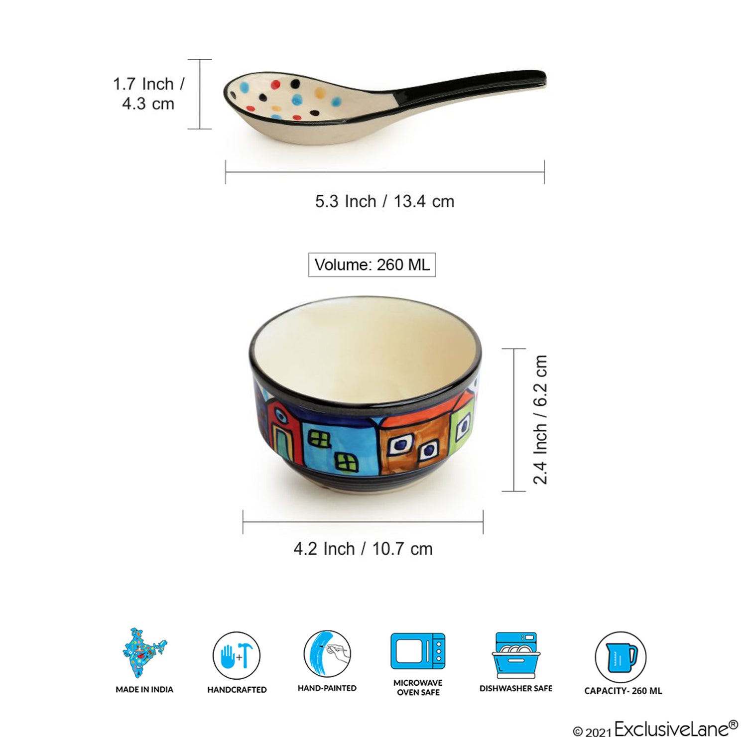 Soupy Huts Handpainted Soup Bowl With Spoon Set (Set of 4, 260 ML, Microwave Safe)