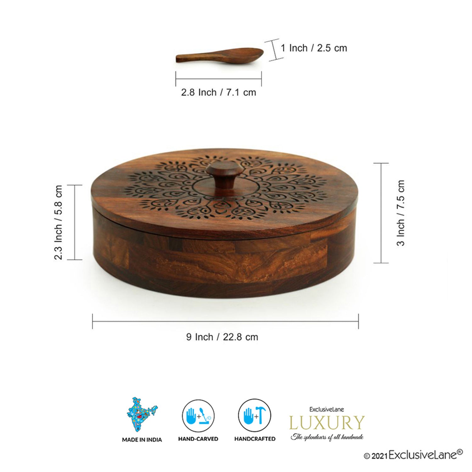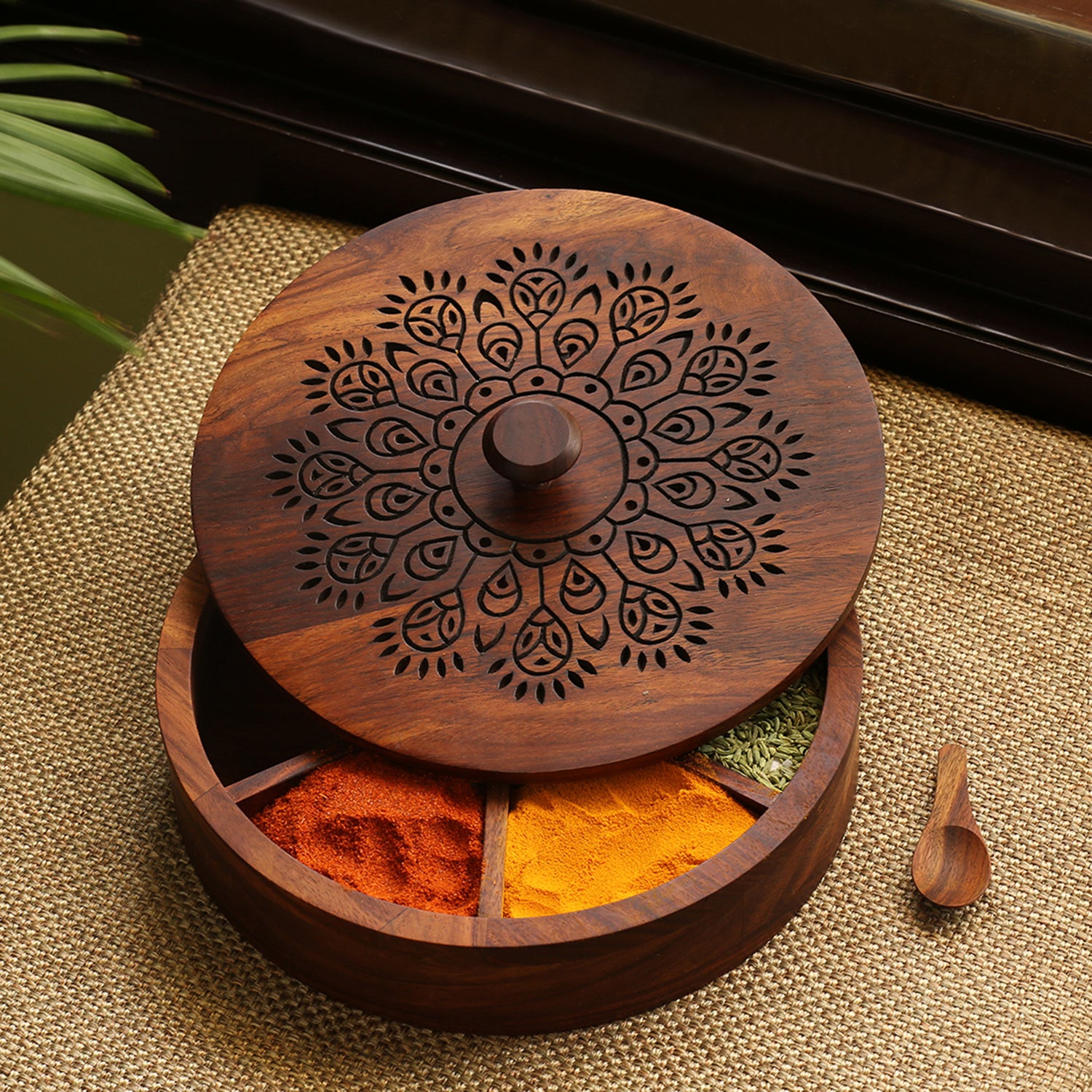 “The Dancing Plumage” – Hand-Carved Sheesham Wood Spice Box (7 Partitions, 120 ml)
