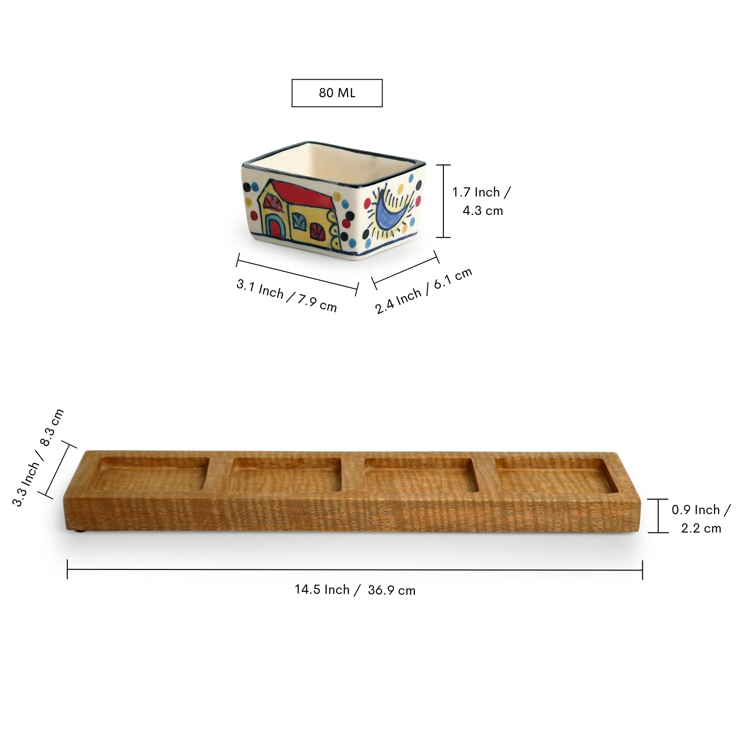 The Hut Hand-Painted Ceramic Chutney & Dip Bowls With Wooden Tray