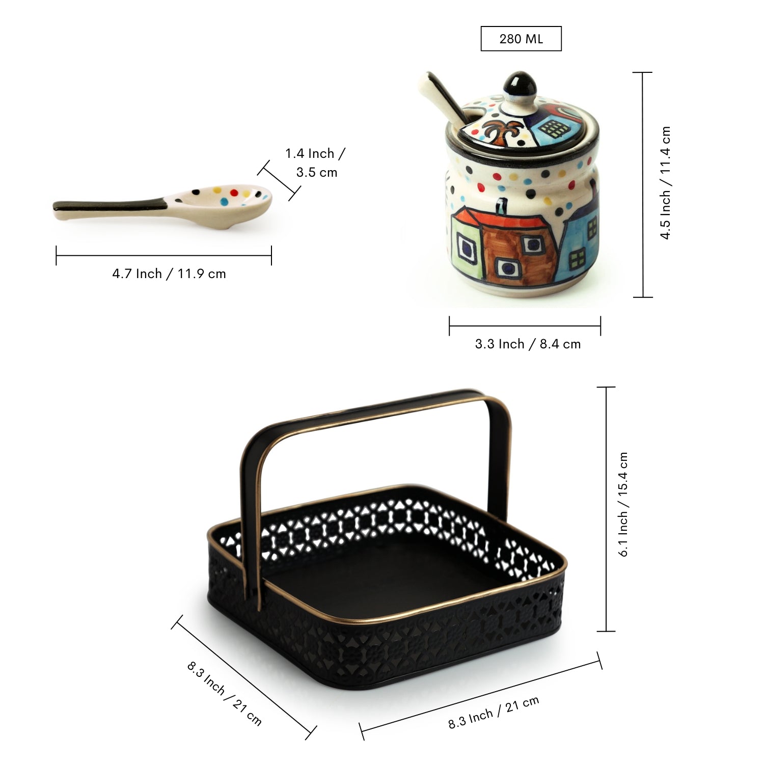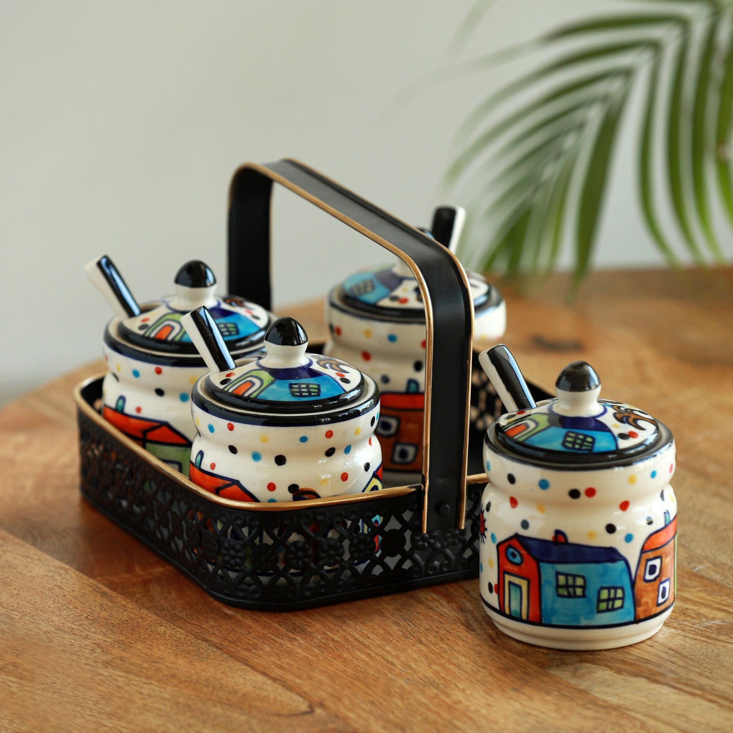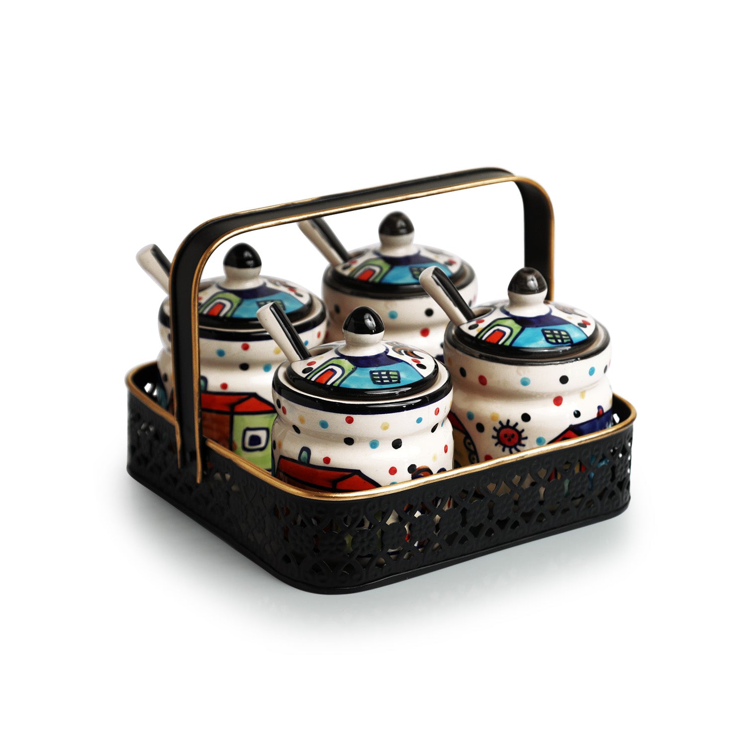 ✔ Includes 4 hand-painted ceramic jars (280 ml each), 4 ceramic spoons & 1 powder-coated iron holder