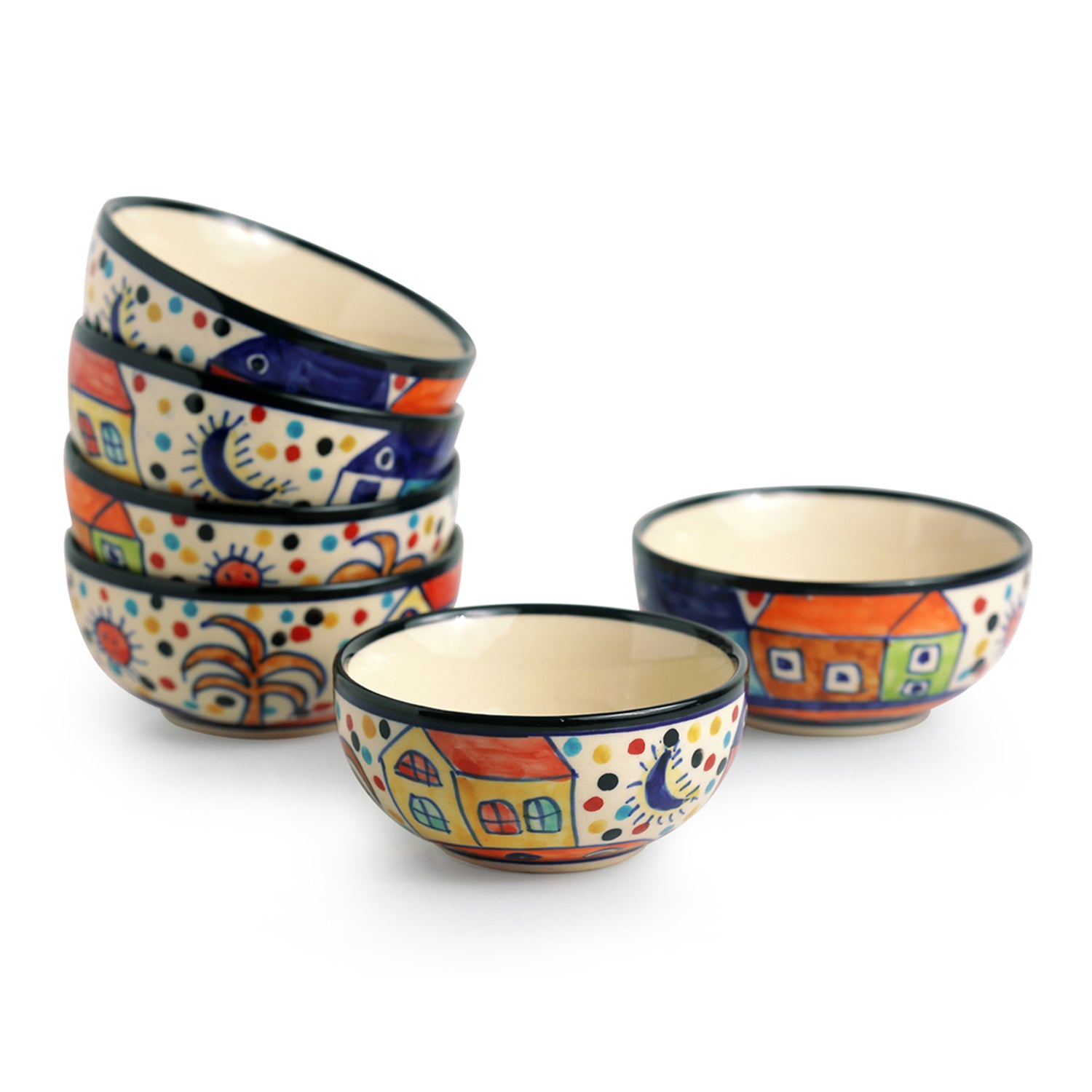 These compact, multi-coloured bowls are perfectly sized for serving snacks, desserts, mouth fresheners, or even dry condiments. With a rounded silhouette and smooth finish, they blend functionality with folk-art flair — a must-have for lovers of handmade beauty and heritage dining.