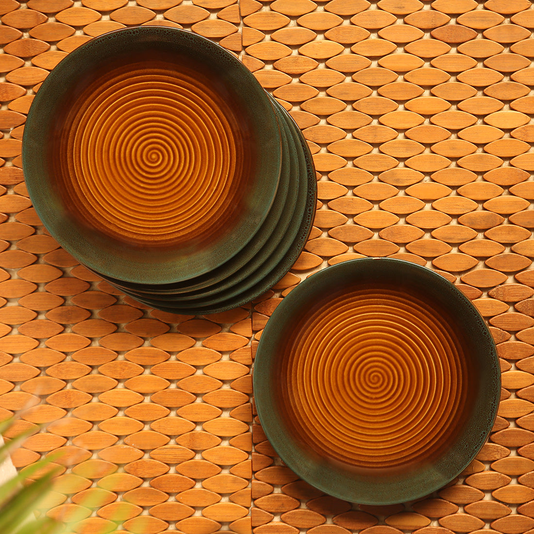 Where fire meets calm and ancient Rome whispers through every glaze, ‘Volcanic Reverie’ draws inspiration from the lost city of Pompeii. Handcrafted in ceramic and double-fired at 1280°C, each plate is a stunning dance of amber spirals and teal-edged serenity—evoking the fierce beauty of lava tempered by the passage of time. A studio pottery classic made to honour both heritage and modern elegance.