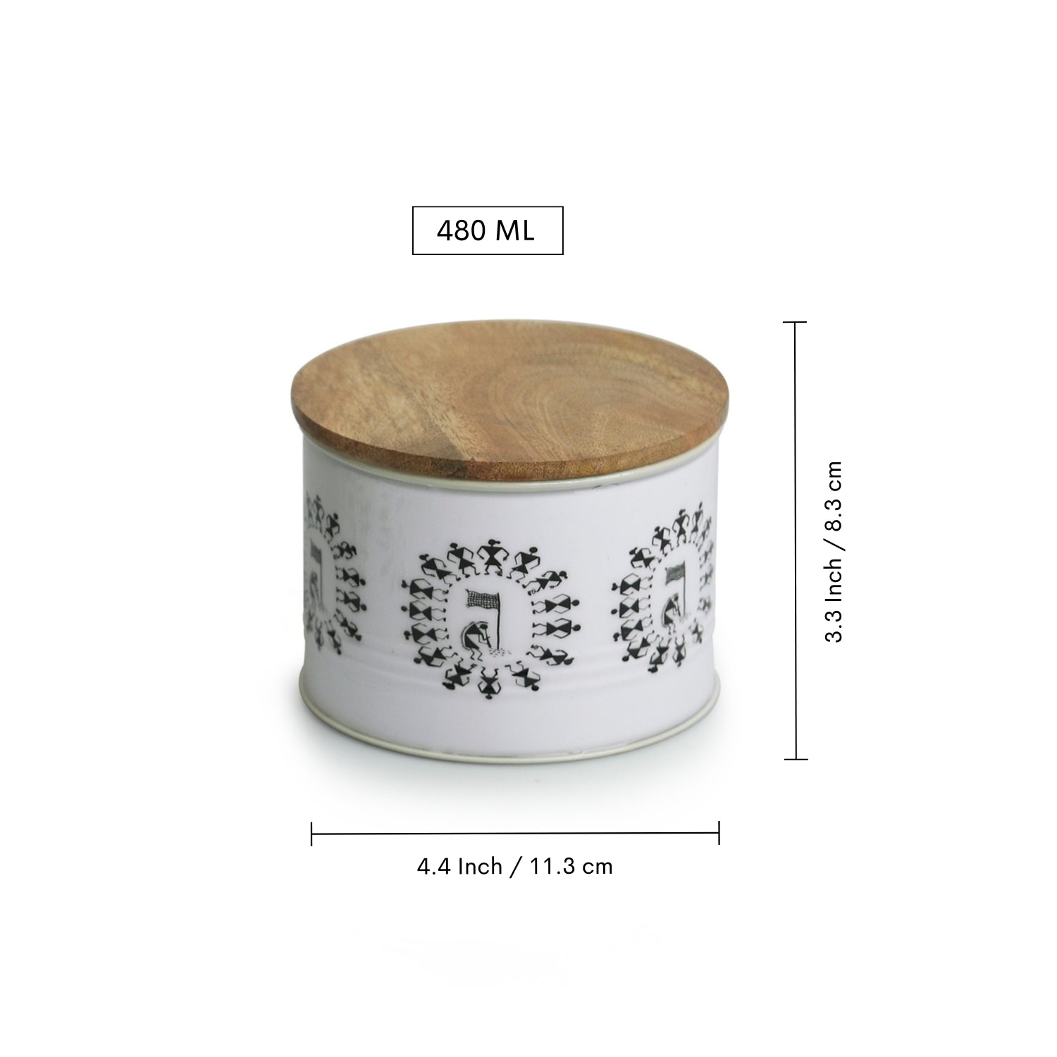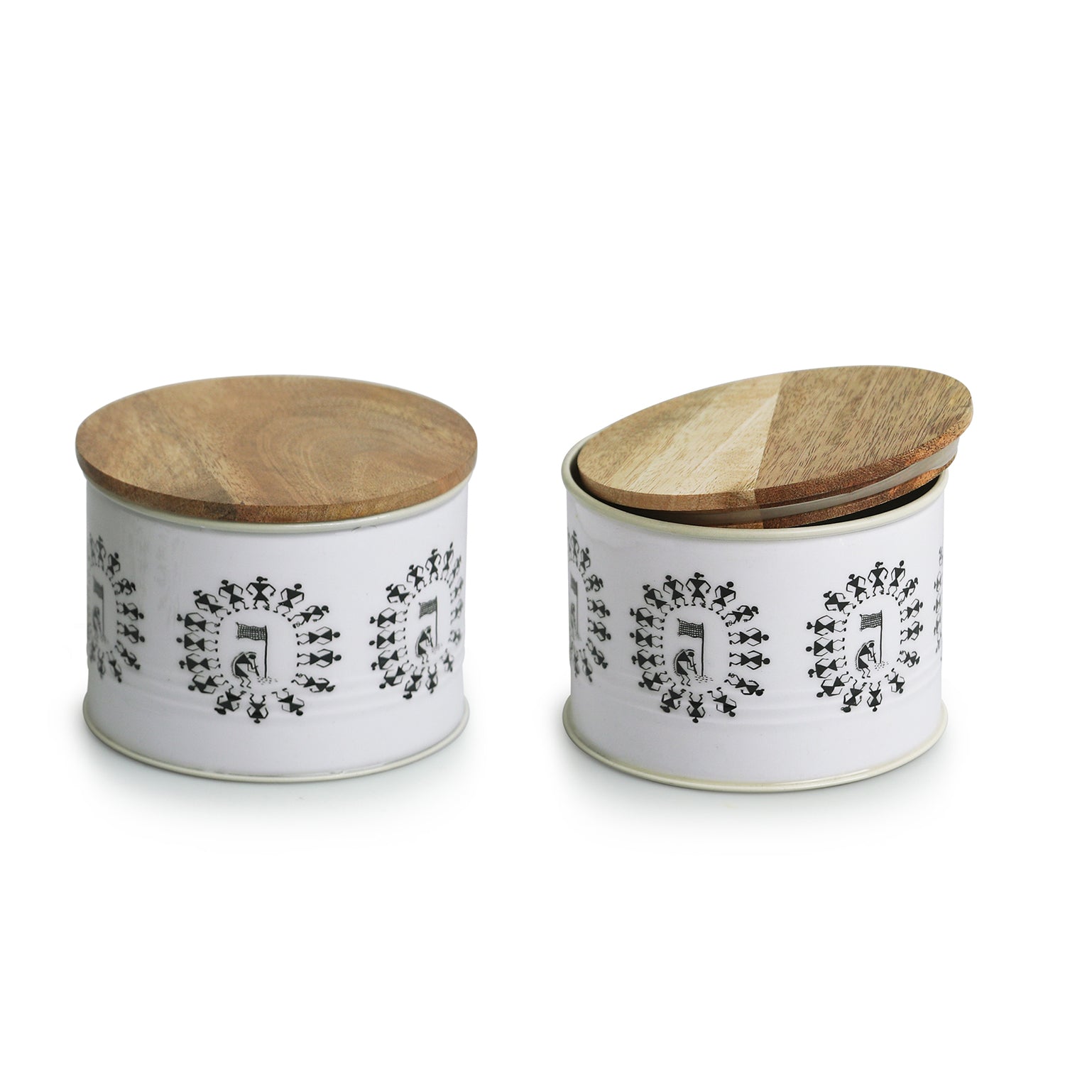 Warli Tales – Hand-Enamelled Iron Storage Jar Set with Mango Wood Lids (480 ml x 2)